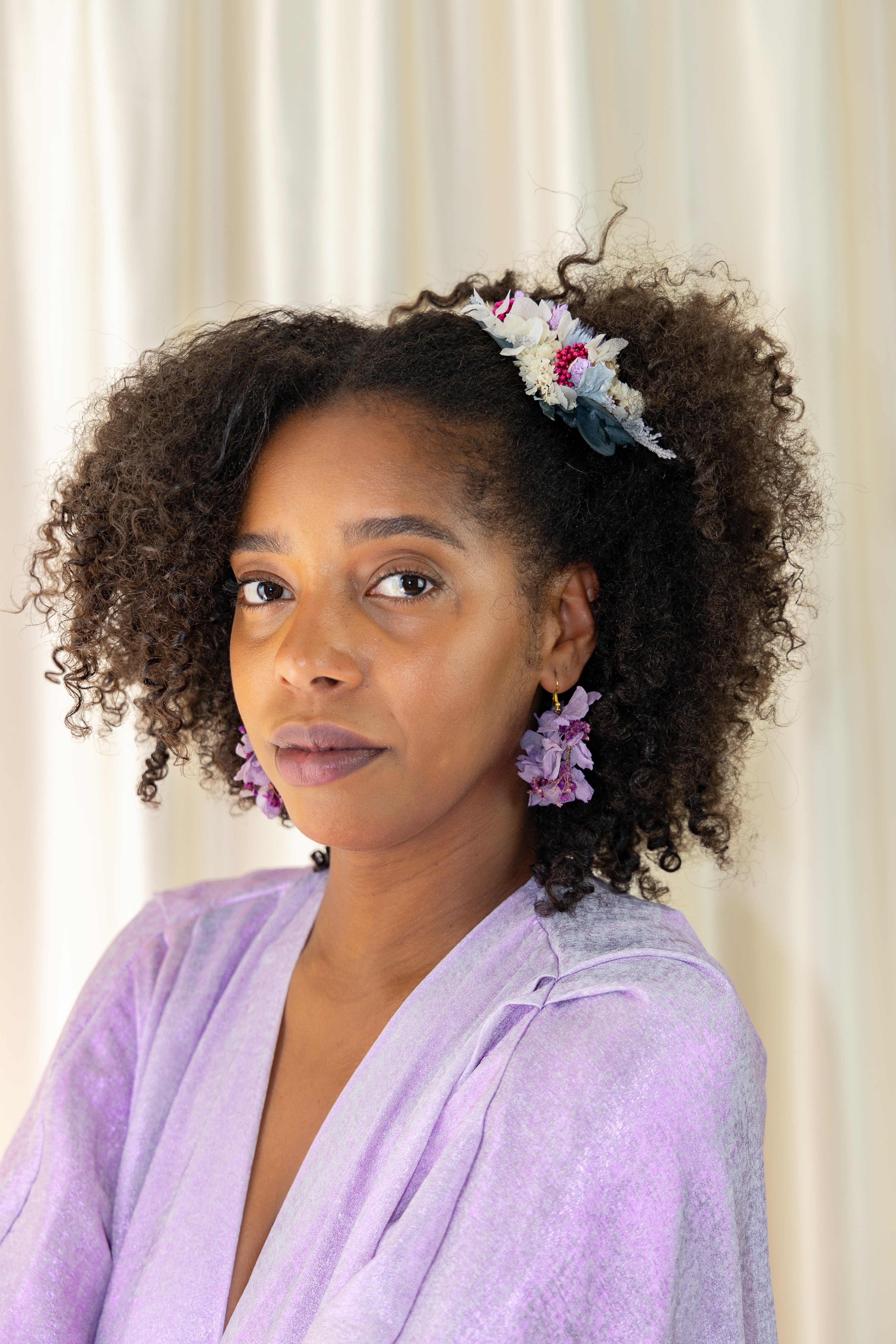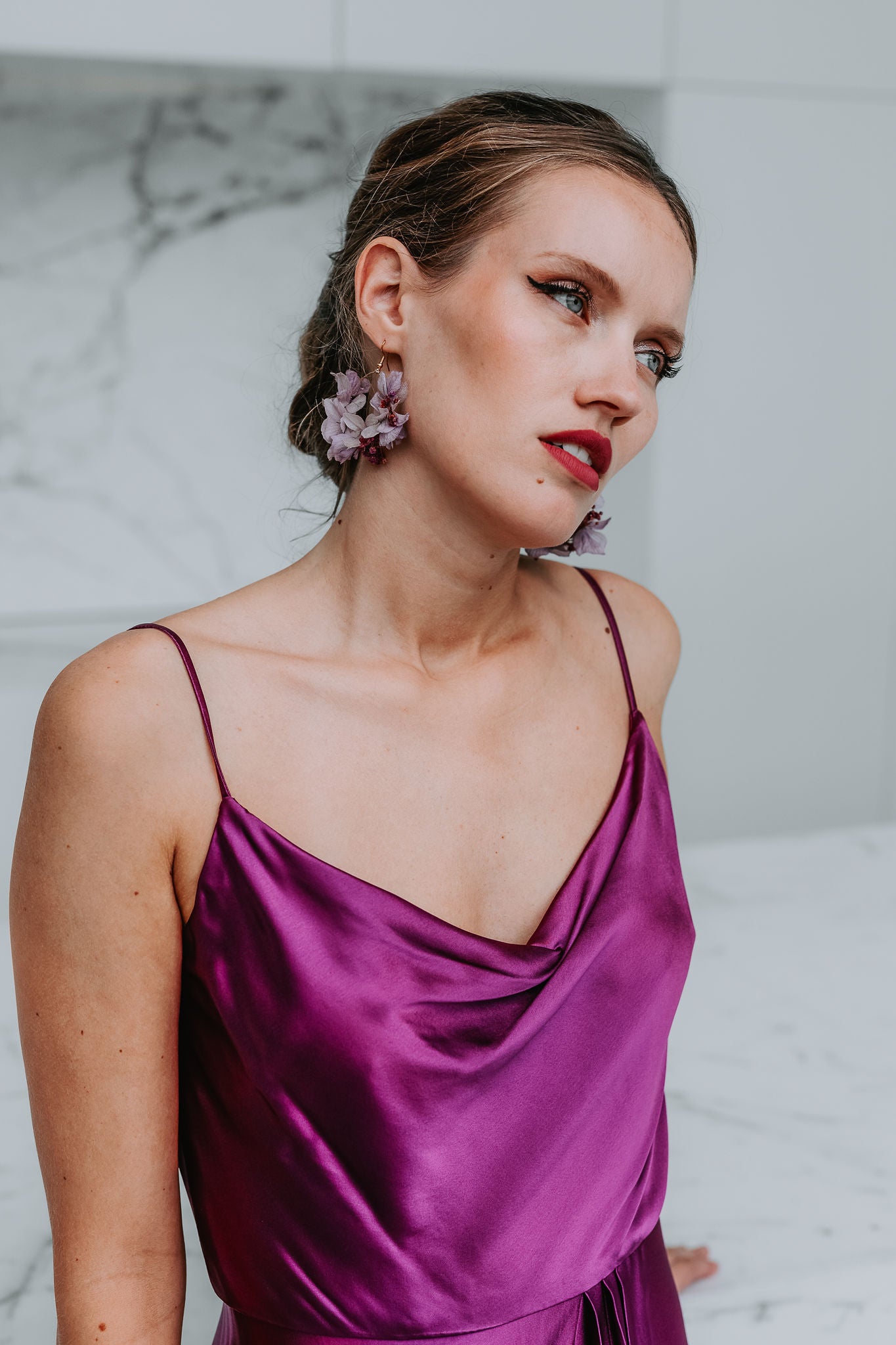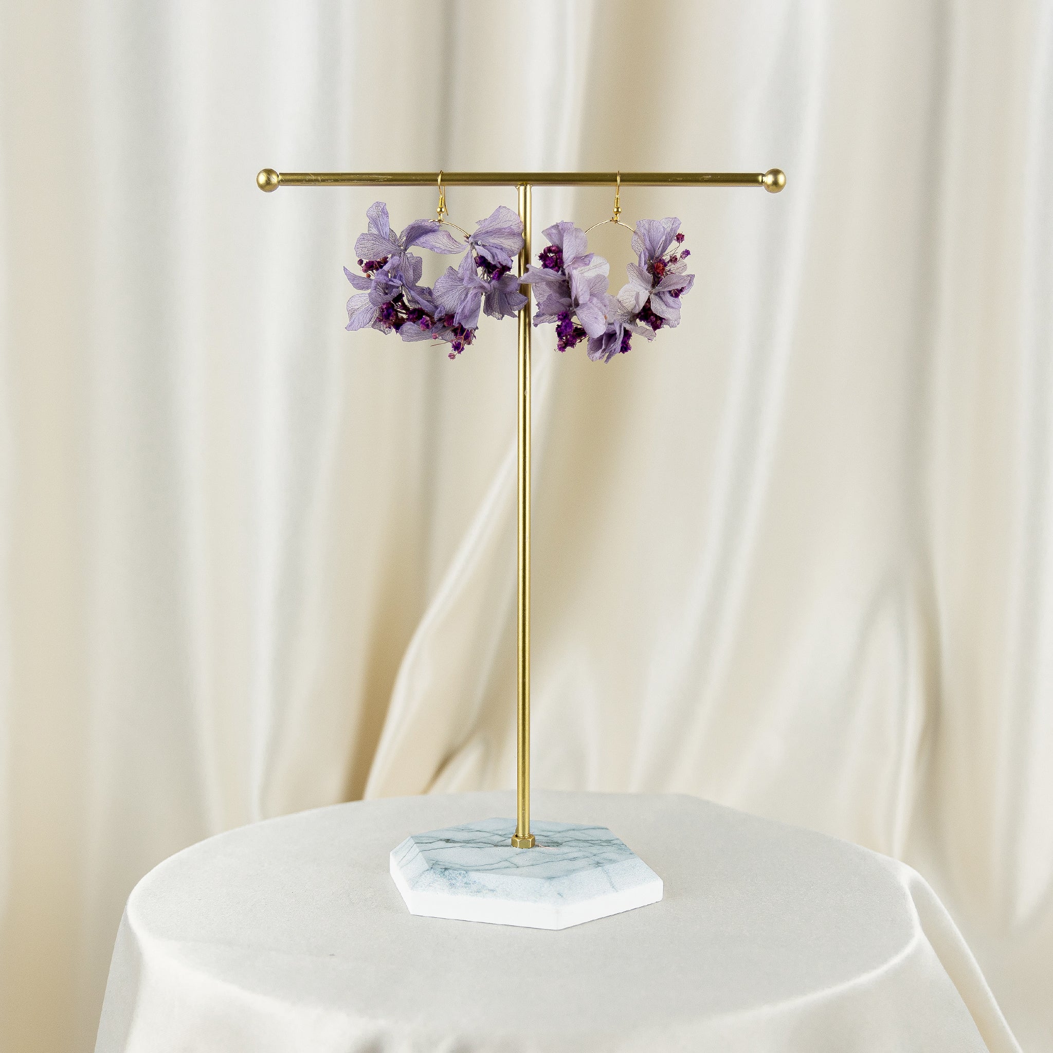 Elysia øreringene er en hyldest til naturlig skønhed og fanger de sarte nuancer af lavendel og lilla. Disse øreringe tilbyder et strejf af elegance og charme, der kan supplere en bred vifte af outfits og lejligheder og tilføje et strejf af haveinspireret charme til dit look.