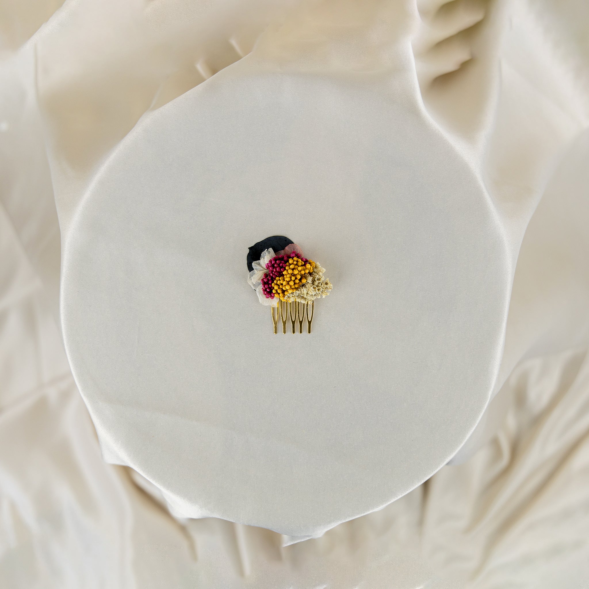 Introductie van de Hannah Mini Hair Comb: een sierlijk maar betoverend accessoire ontworpen voor zowel vrouwen als kinderen, met trots behorend tot de prachtige Hannah Collection. Deze mini-haarkam is versierd met een delicate opstelling van gestabiliseerde rijstbloemen, hortensia's en miniatuur gypsophila, die de essentie van natuurlijke schoonheid vastleggen.