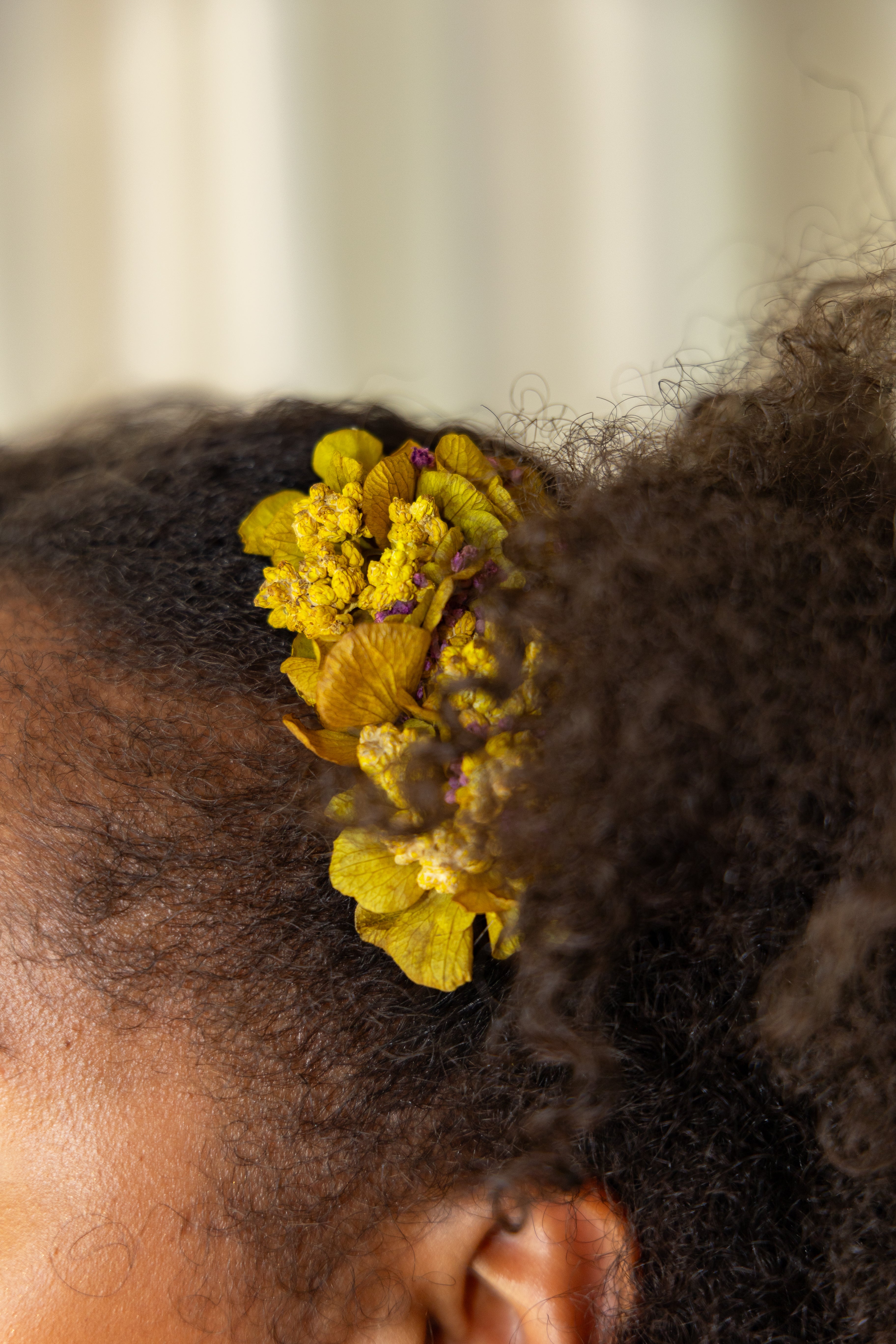 Introducing the Lara Large Hair Comb: A stunning centerpiece within the Lara Collection, expertly crafted from ocher yellow hydrangeas and delicate purple mini gypsophila. Measuring approximately 10-13 cm in width, this large hair comb is a captivating addition to your hair accessory collection, designed to make a statement.