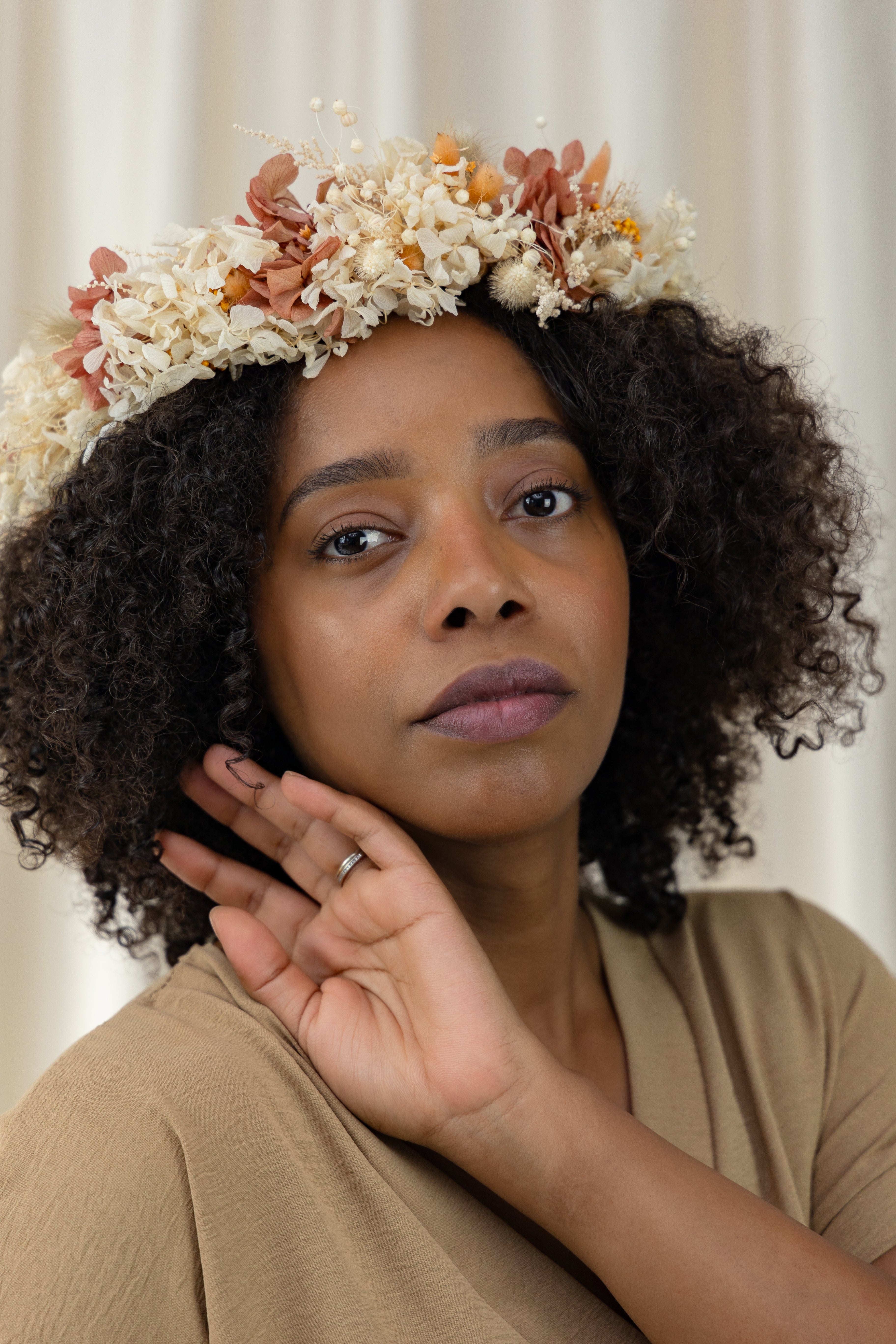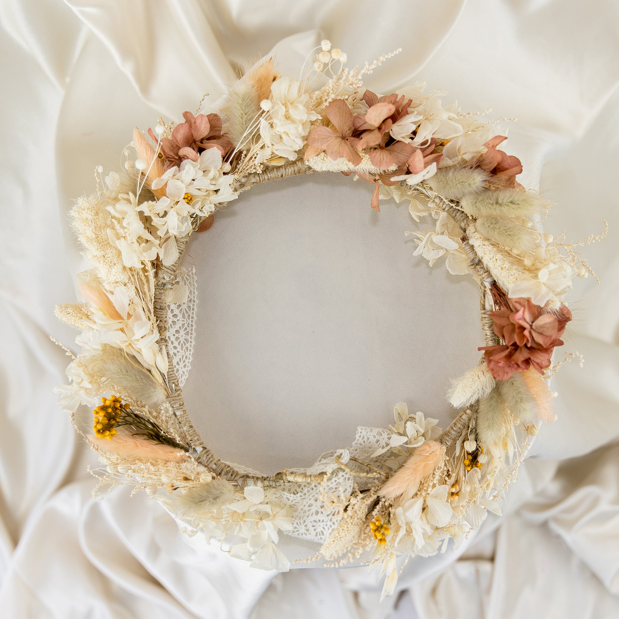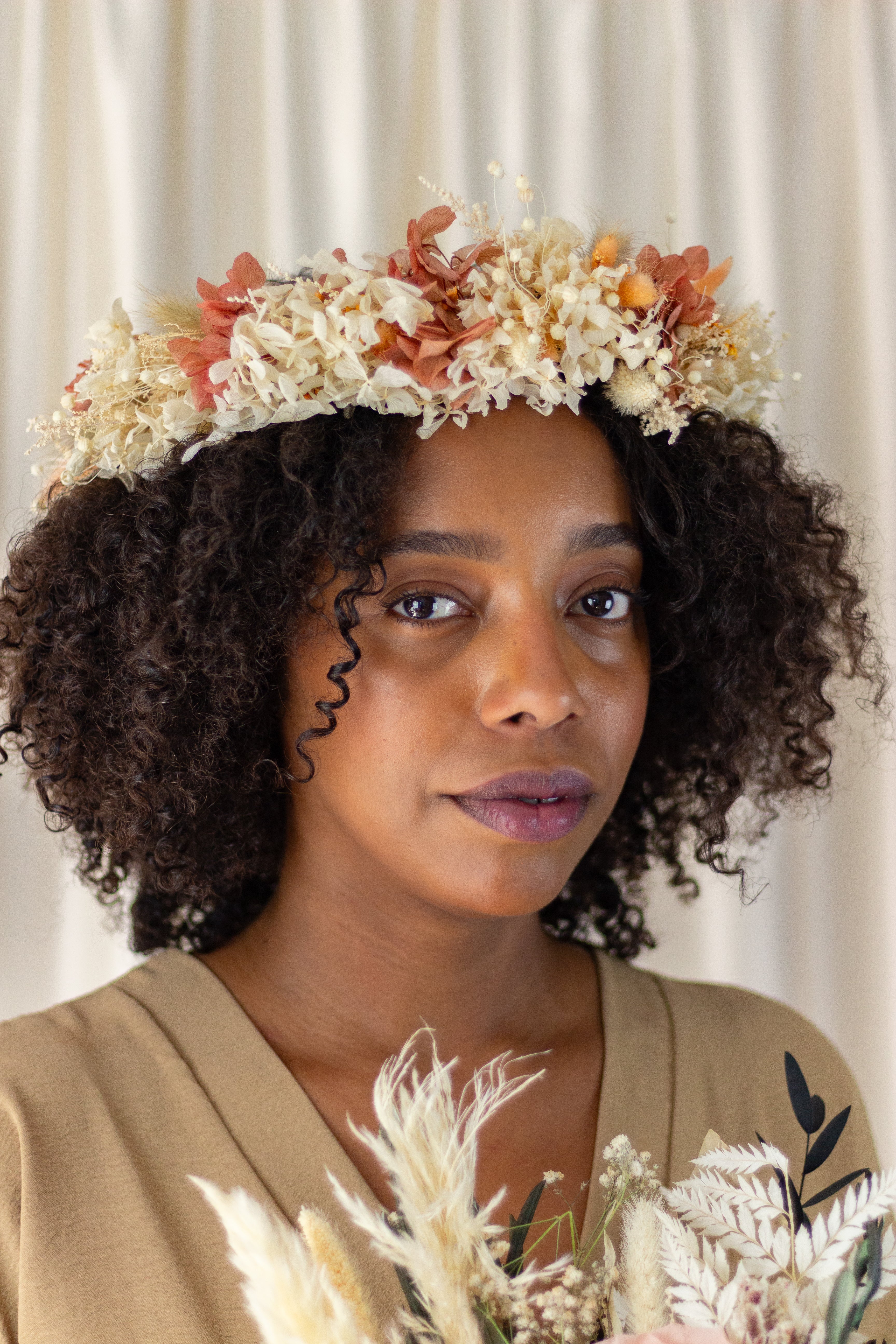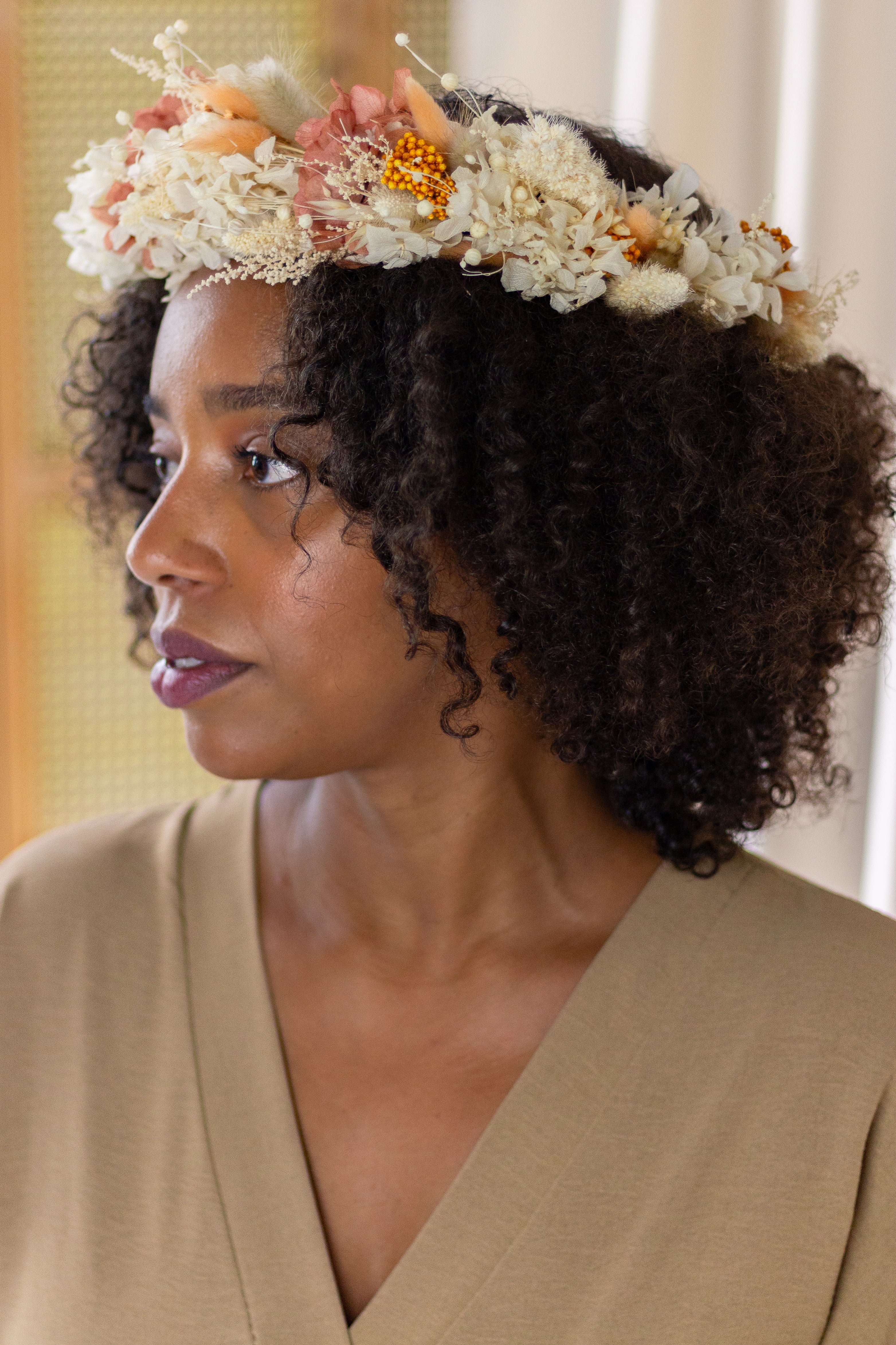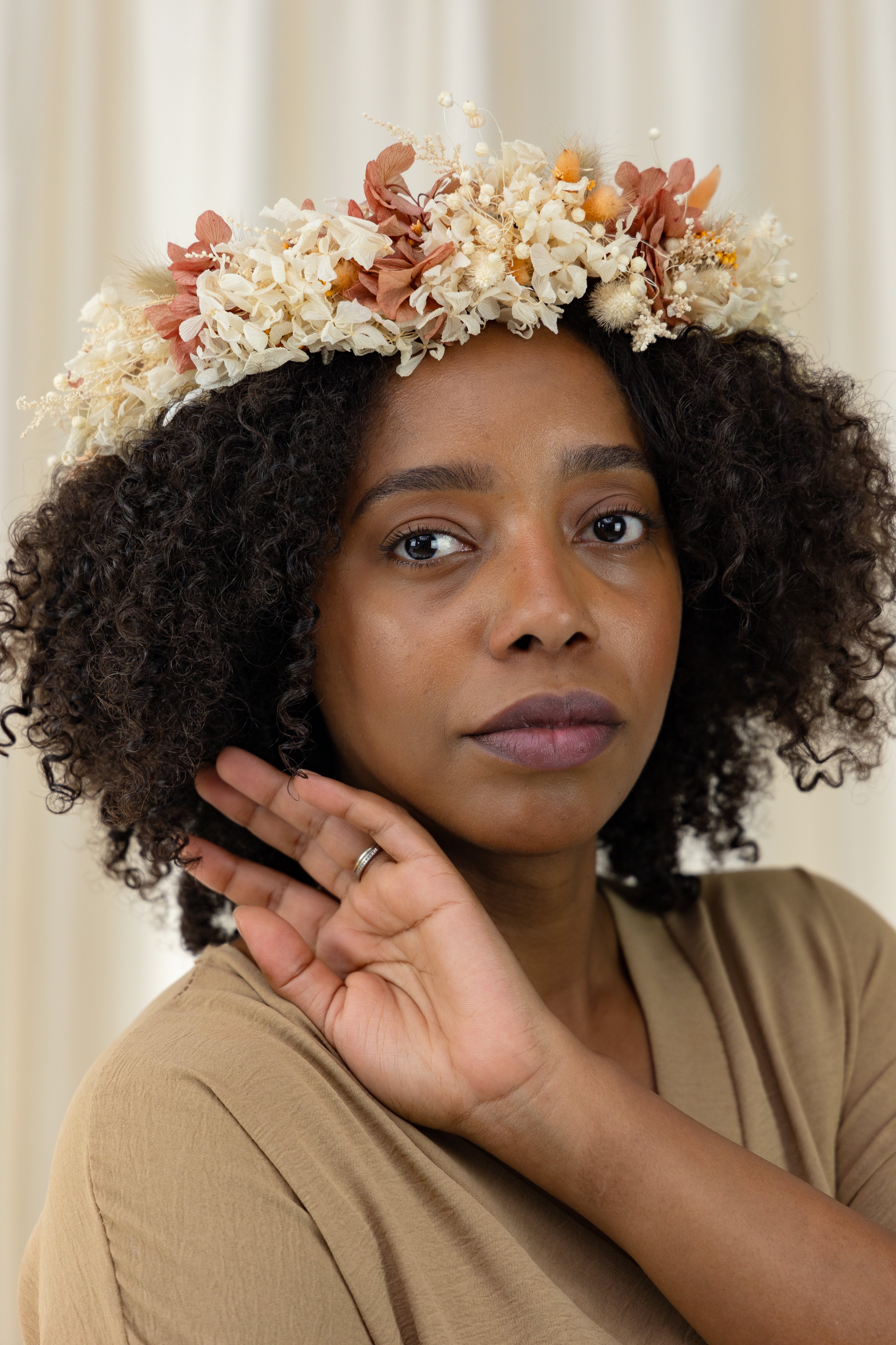 The Lizzy Flower Crown é uma peça de afirmação que incorpora a essência criativa e de espírito livre do estilo boêmio. Capta a beleza natural das flores e preserva-a para um acessório duradouro e encantador. A combinação de cores, incluindo o branco sereno, café rico, marrom terroso e rosa suave, cria uma coroa que exala elegância e charme.